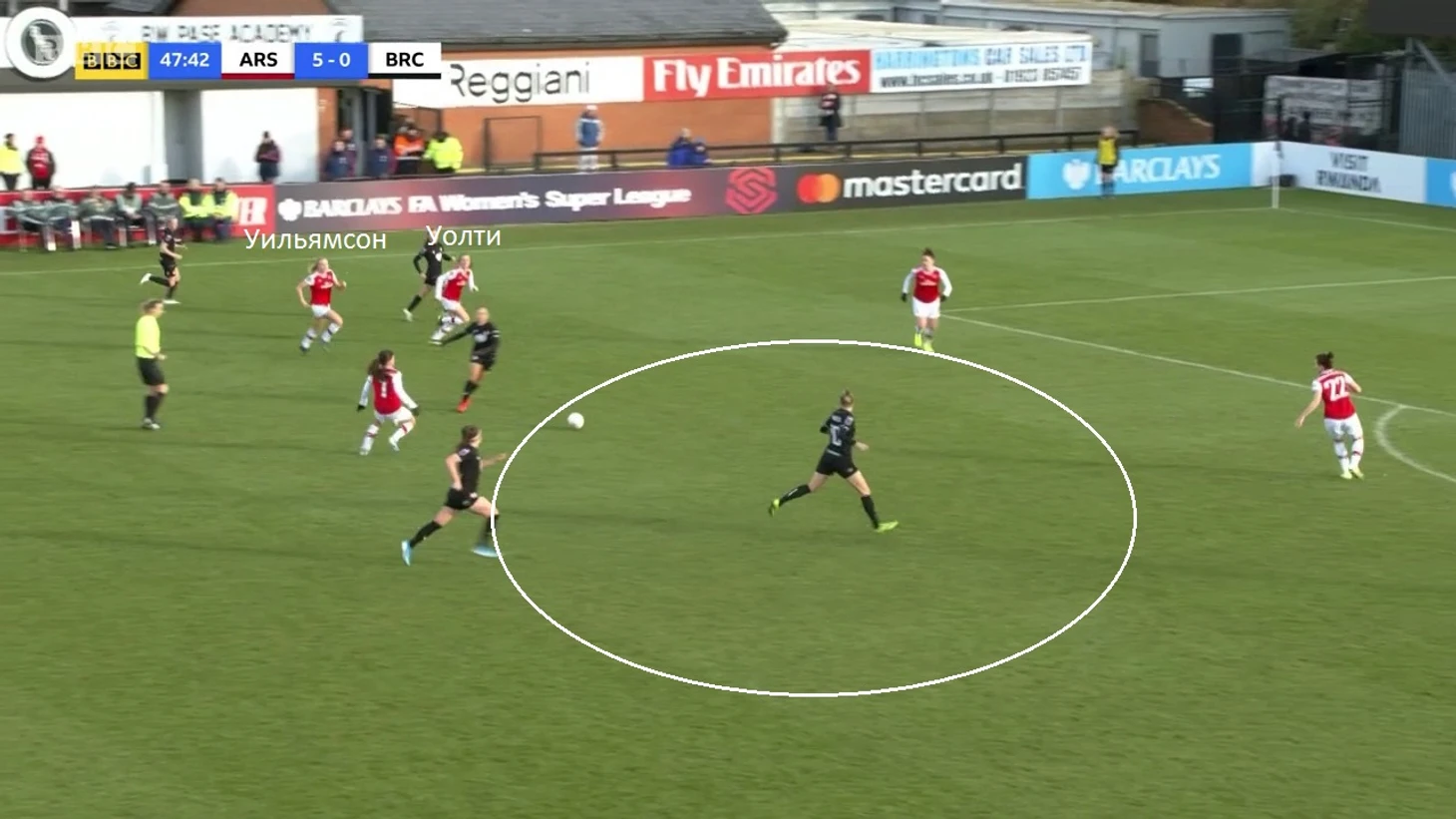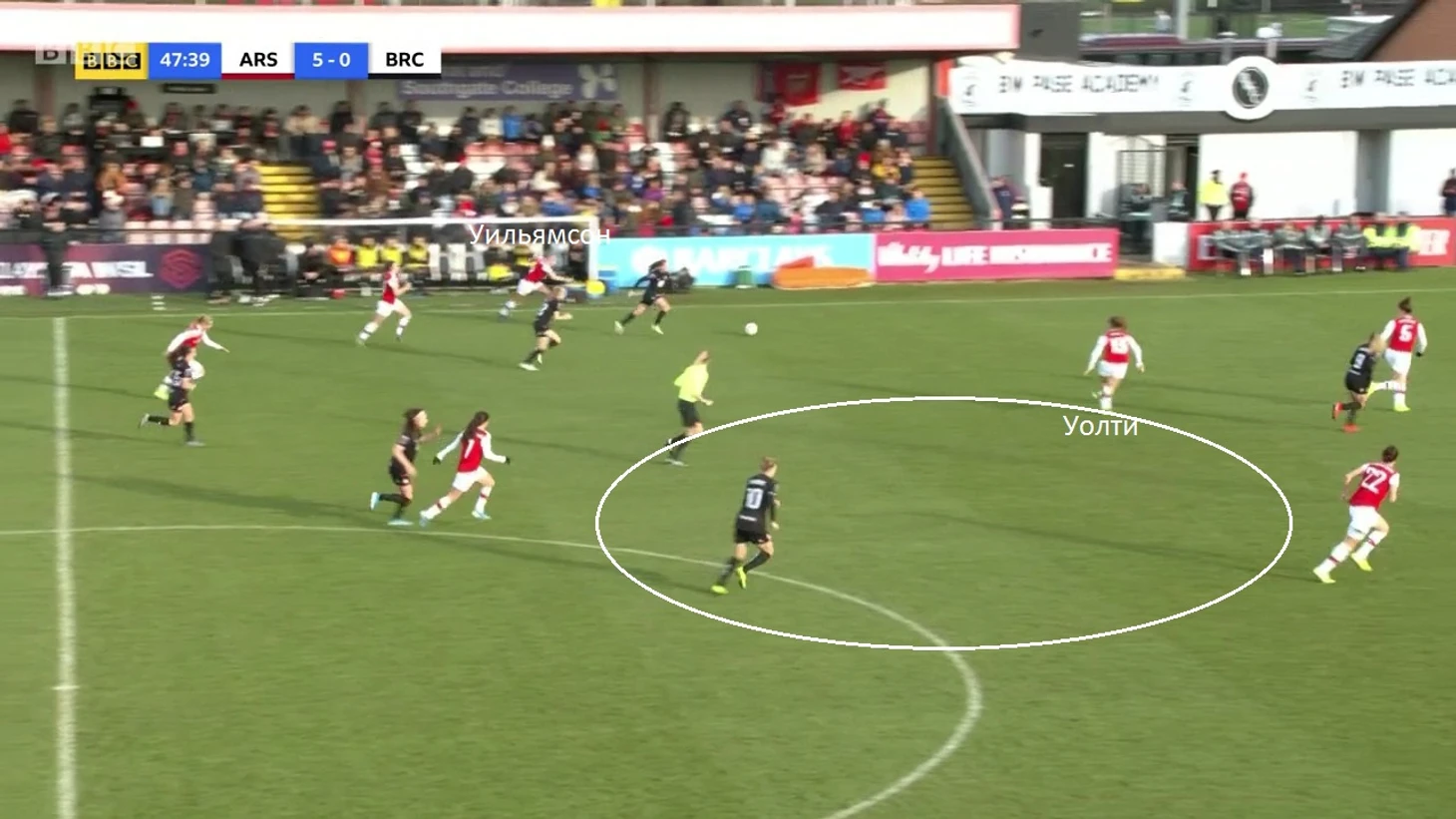 Наставник "канониров" Джо Монтемурро удивил стартовой расстановкой: "Арсенал" редко играет с тремя центральными защитниками и так же редко без капитана Ким Литтл. Но и в такой формации "пушкари" умно перемещаются на поле, страхуют друг друга, меняются позициями и хорошо прессингуют. Единственный минус, за который "Бристоль" так и не смог наказать, – уязвимость на правом фланге. При прессинге Лия Уильямсон, правый центральный защитник, высоко выдвигалась по флангу. Если гости этот прессинг разбивали, то Лия Уолти, игравшая в опорной зоне, должна была разрываться: либо страховать фланг, либо держать свою зону.