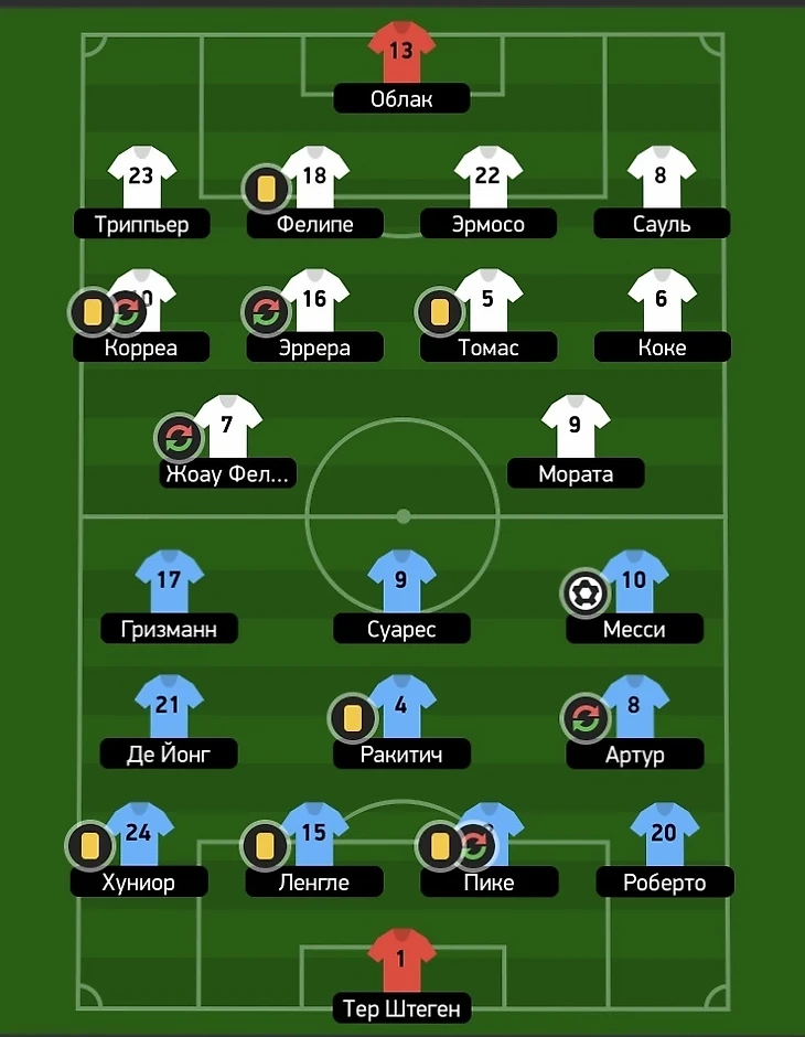 Всю неделю ходили слухи о том, что Симеоне готовит к Сауля к игре слева в защите, к игре против Месси. Так и получилось. Тренер Матрасников выпустил привычные 4-4-2 с широким объемом работы всей середины поля и Жоао Феликсом в роли свободного нападающего, имеющего много задач от тренера.