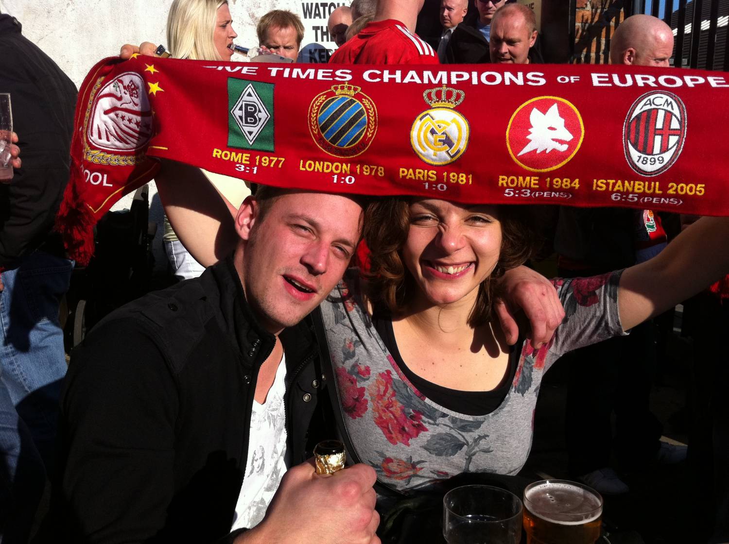 Как вы знаете, я облажался с флагом. У меня их с собой было 2: российский (бело-сине красный) и Субенийский (бело-красно-синий). Спасибо Удовене, он нашел, у кого же встречаются такие цвета. В общем, Кристин просила меня поменять мой российский флаг на ее шарф "Ливерпуля". Но флаг останется со мной, это память. Хотя, быть может, нам удастся договориться в Москве с баром "Фуллерс", в котором мы теперь будем собираться смотреть футбол, и они повесят его у себя.