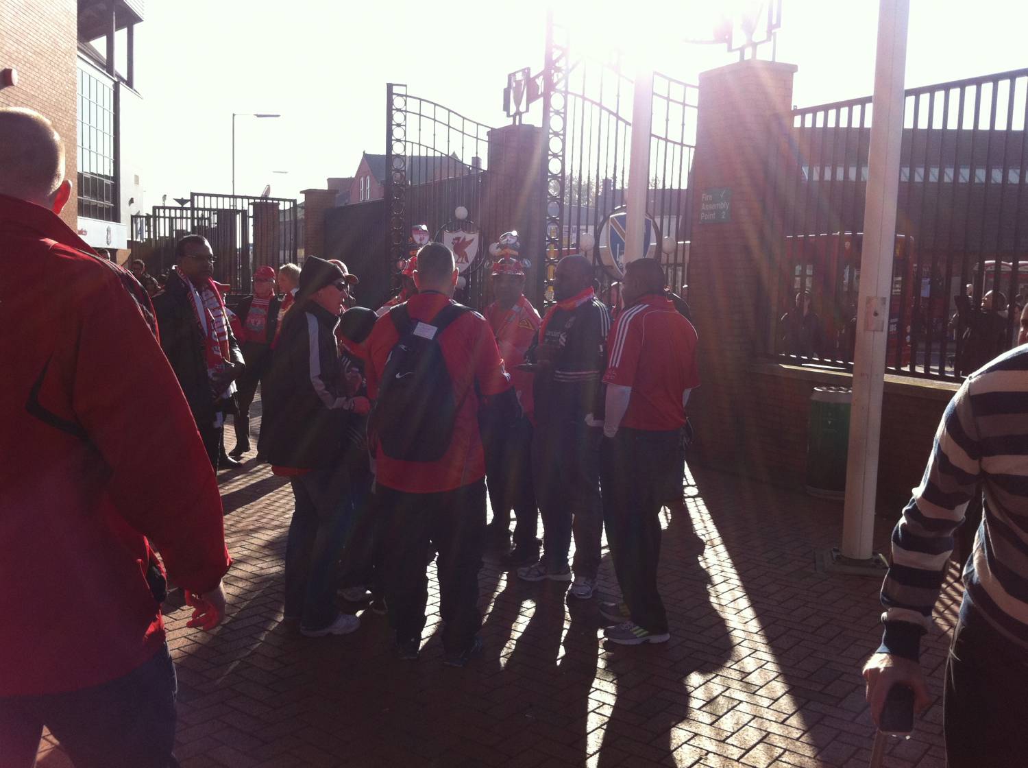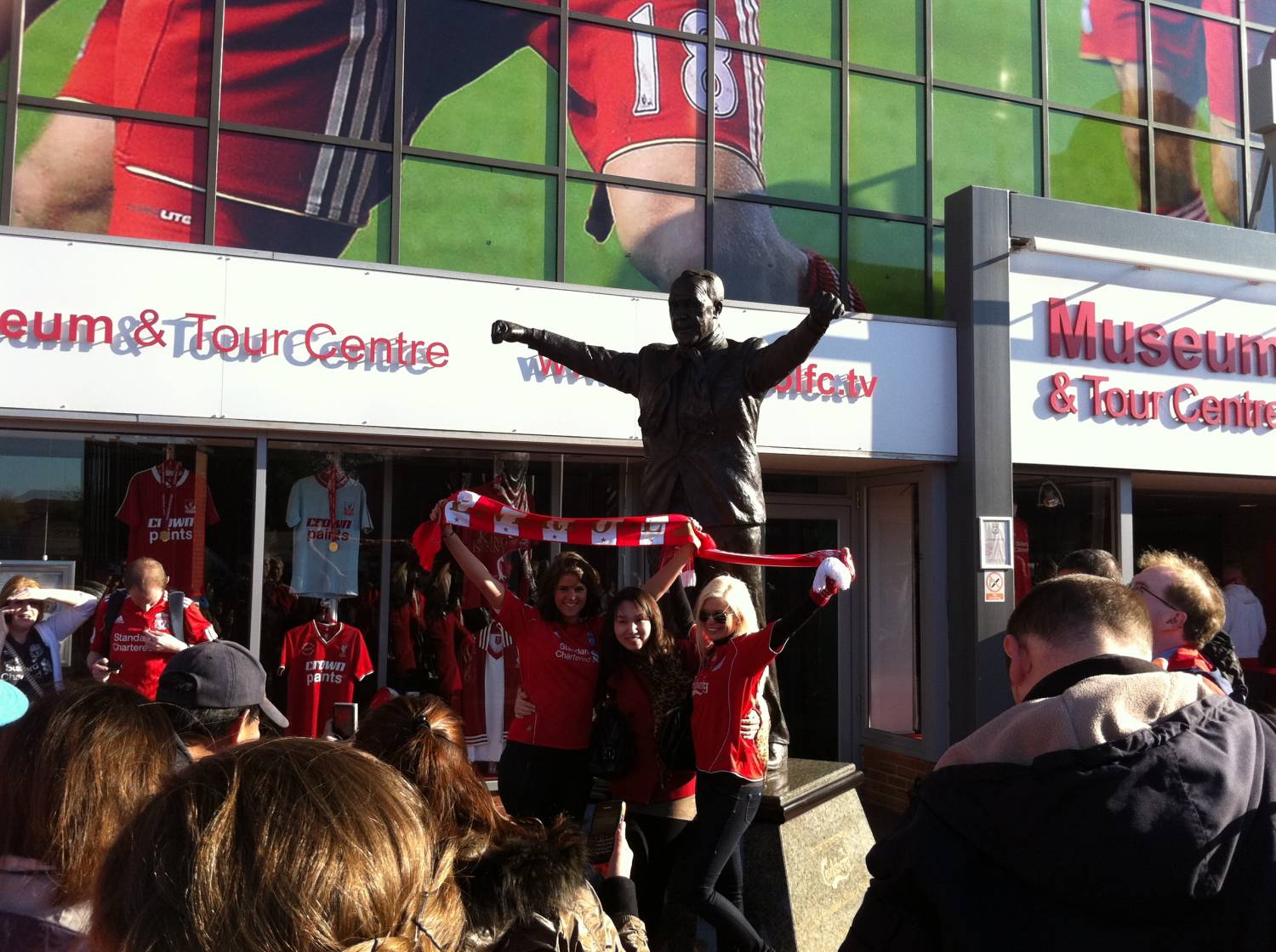 Где уже все кипит и бурлит, где кучи народов со всех стран мира и во всевозможной атрибутике толпится перед стадионом, фотографируется на фоне памятника Биллу Шенкли, где куча продавцов пытается продать свой товар, заманивая народ кричалками или песнями стадиона.