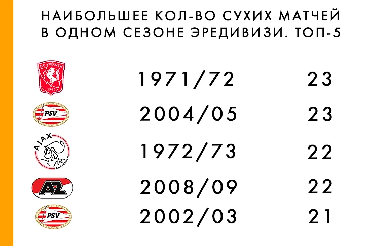 Если АЗ сохранит текущий темп, то сможет выйти на итоговые 24-25 матчей на ноль. Да, это будет новый рекорд Эредивизи. Ниже представлены ТОП-5 команд. Надежная защита – залог победы в любом турнире. Из этой пятерки только «Твенте» со своей супер-обороной (Дрост, ван Ирссел, Оранен, де Фриз и Схрейвер в рамке; кипер позже перейдет в «Аякс», а первые трое сыграют в финале Кубка УЕФА) не удалось стать чемпионом (3- место вслед за «Фейенордом» и «Аяксом»).