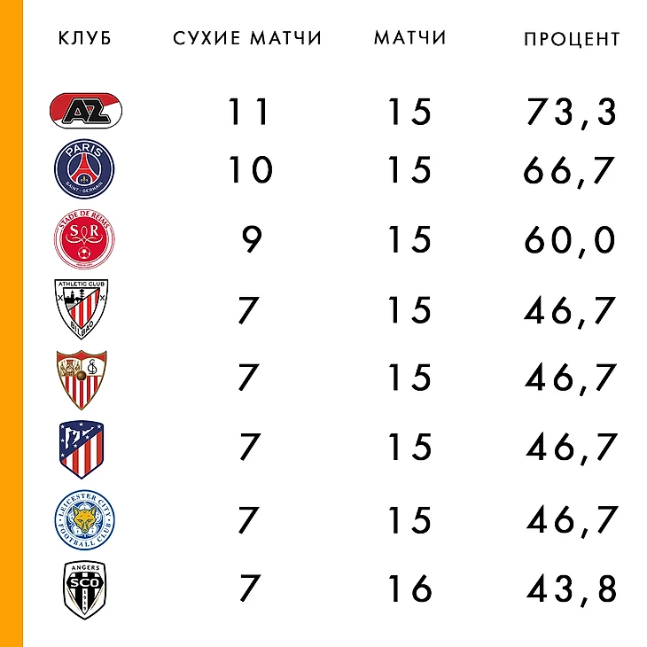 По количеству «сухих» матчей АЗ с отрывом опережает своих оппонентов в Эредивизи. Но если взглянуть на ведущие чемпионаты, то сравнение будет вновь в пользу команды Арне Слота. Смотрите сами: