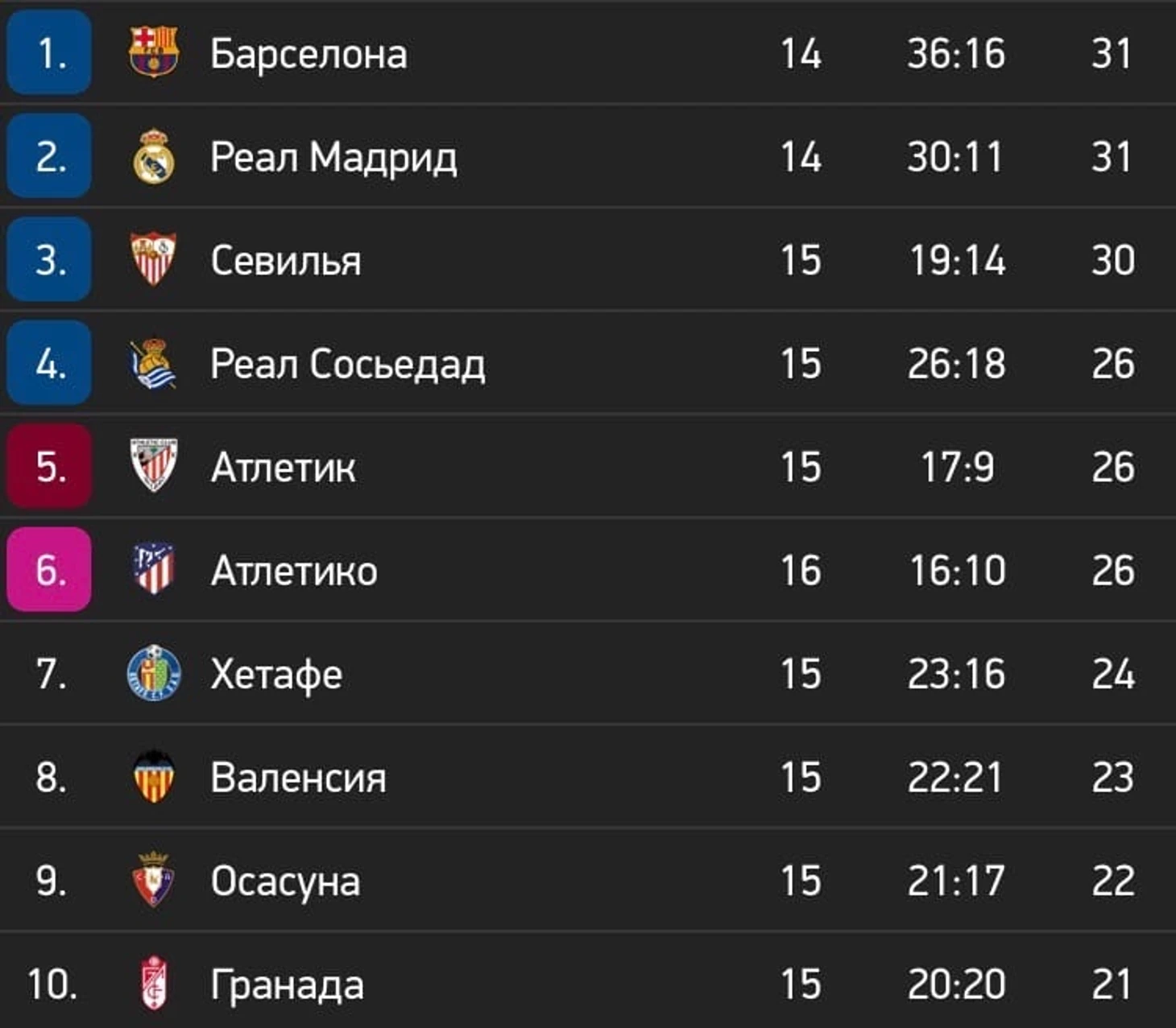 На данный момент таблица чемпионата Испании выглядит следующим образом. В случае успеха на выходных Валенсии и Хетафе, Атлетико вообще может спуститься на 8 место.
