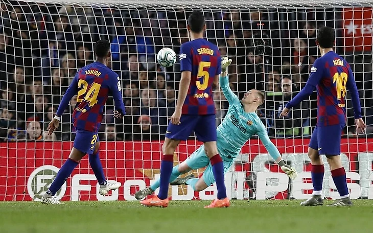 Игроки Барсы продолжали проводить атаки через правый фланг и настырно продолжали просто простреливать в штрафную, но вместо этого чуть не пропустили третий гол. Вновь удар из пределов штрафной, вновь рикошет, но что творит Тер Стеген... уже заваливаясь в угол, немец успел выставить правую руку и отбить мяч, который для других вратарей был бы «мёртвым».
