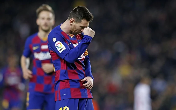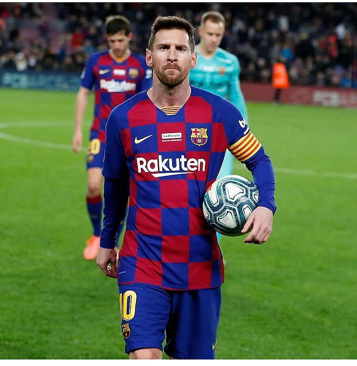 Месси забирает мяч, которым он оформил хет-трик