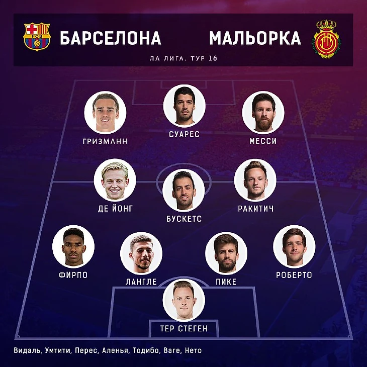 На данную игру Эрнесто Вальверде выпустил максимально предсказуемый состав. Место в рамке мы, как всегда, не обсуждаем, тут Тер Стеген. В защите справа налево вышли: Роберто, Пике, Лангле и Фирпо (поговаривают, что к «Эль-классико» Альба должен вернуться в строй). В центре в опорную зону вернулся Бускетс, а ближе к атаке располагались справа Ракитич, слева Де Йонг. И атакующая тройка - МСГ (Месси-Суарес-Гризманн). Состав боевой, так что вечер для «Мальорки» ожидался не из легких.