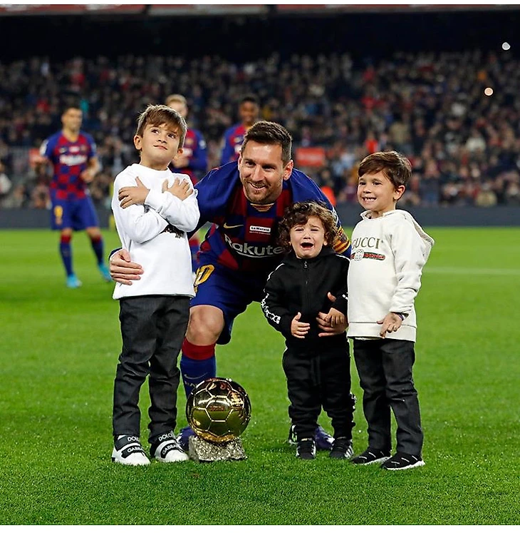 Серьёзный Месси, довольный Месси, плачущий Месси и улыбчивый Месси на одном фото! Нет, это не разные личности неземного аргентинца, это Лео с 3-мя сыновьями презентовал публике «Камп Ноу» свой 6-й «Золотой мяч».