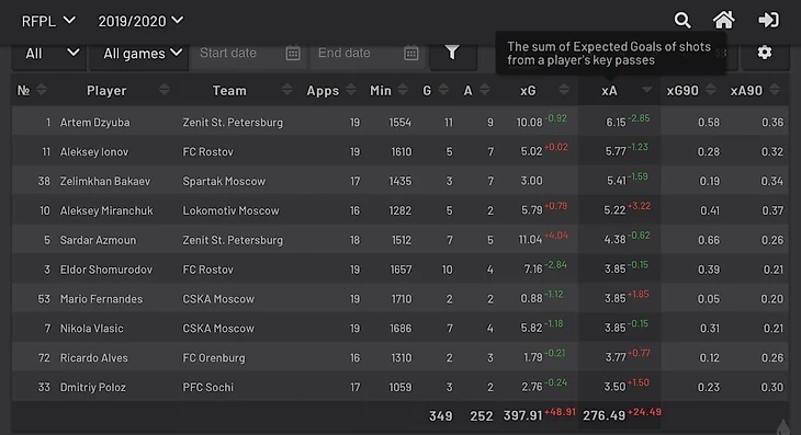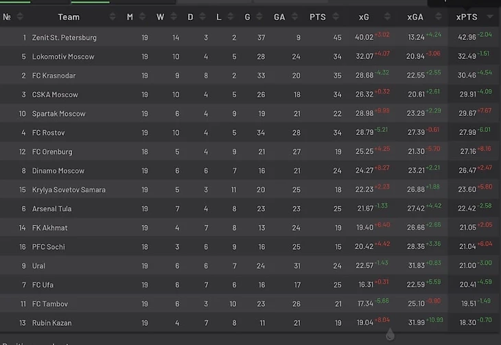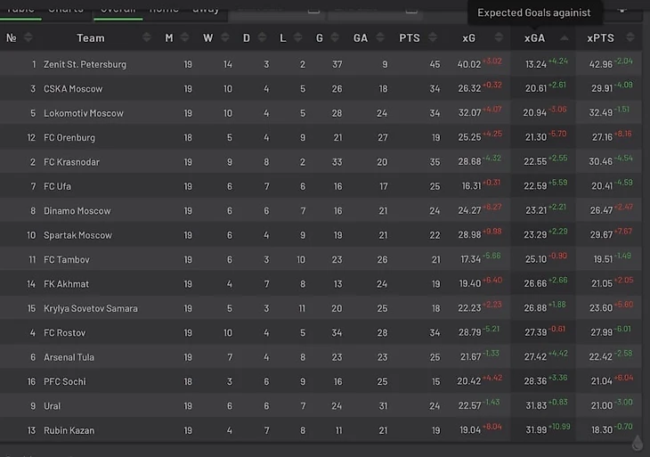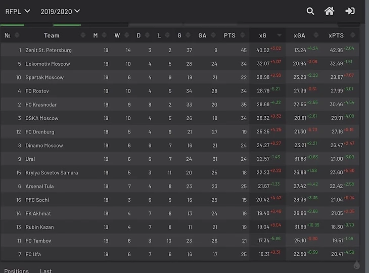 Мы видим лидера, четверых преследователей и… всех остальных. Даже Арсенал Тула, идущий шестым (просто какое то чудо) еще не гарантировал себе место на следующий год в Премьер-лиге. От зоны вылета его отделяют всего 6 очков, даже до 5 места больше. Мда, об уровне чемпионата России и его исполнителях мы еще скажем, но общие тенденции игры поддерживаются. (вся статистическая выкладка взята с сайта Understat)