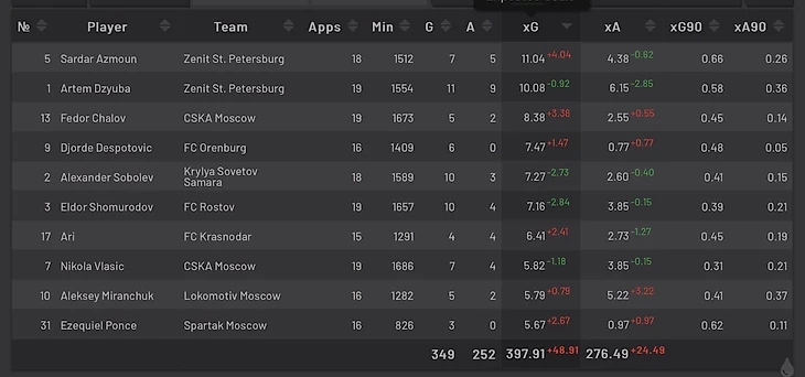 А вспомним, что у нас есть лидер сборной Артем Дзюба, который абсолютно заслуженно является таковым. Очень хорошие показатели, на уровне топовых европейских. Азмун действительно плохо реализовывает (-4), которые могли дать уже сейчас золотые медали питерцам.