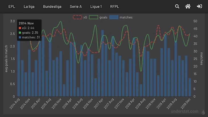 За 19 туров в нашей любимой лиге было забито 349 мячей (примерно 2,28 за игру). Но при этом показатель xG говорит о 397 возможных голах. Разница составляет +48 пункта. Например, в Англии на данный момент забито на 28 голов меньше, чем по xG. Что нам дает этот показатель?