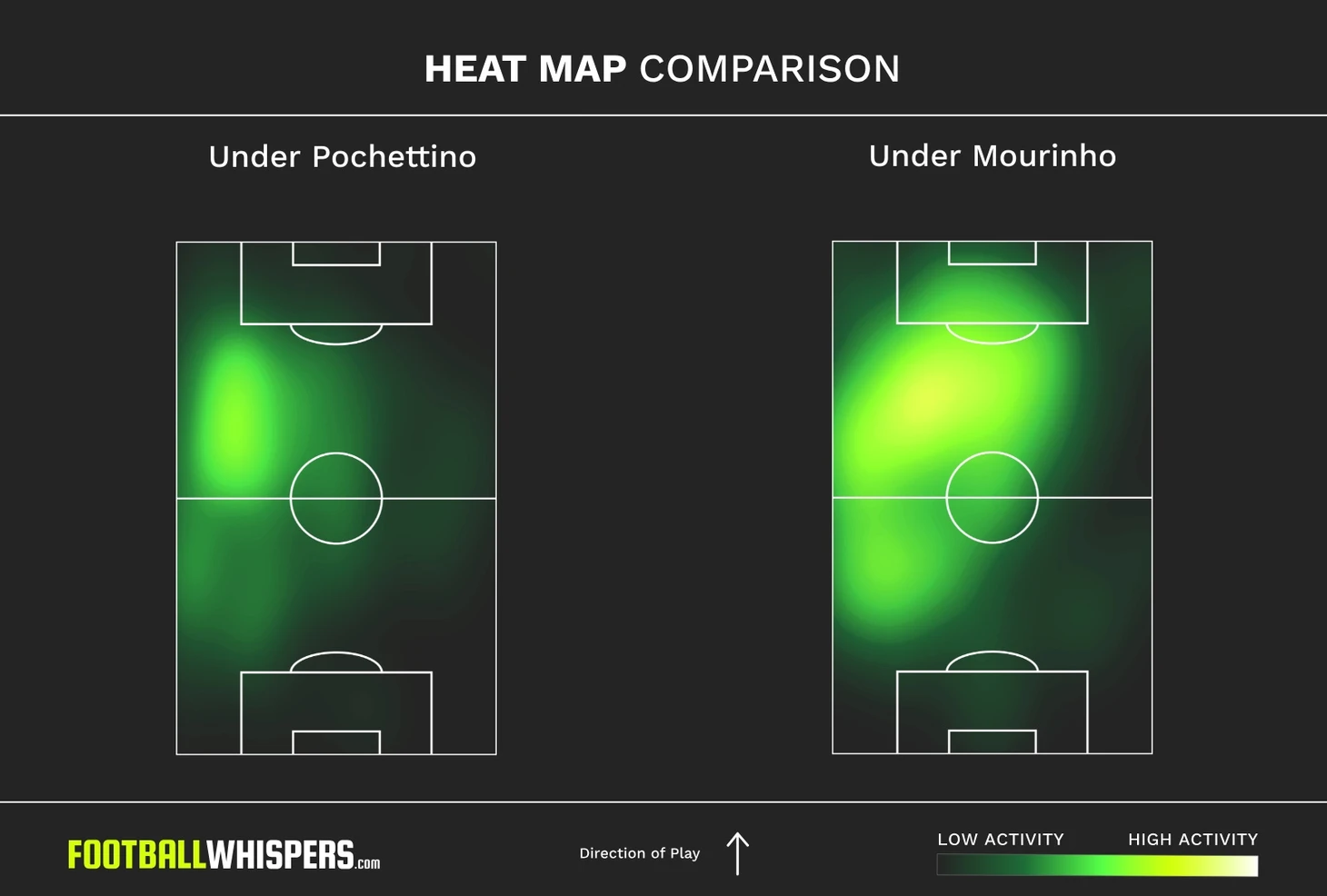 Одна из первых вещей, которые сделал Моуринью после прихода в «Тоттенхэм» – перевел Деле в более высокую позицию. Изменение положения Деле при Почеттино и Моуринью можно отследить через тепловые карты. Исключение составляет последняя игра с «Вулверхэмптоном» – схема «Тоттенхэма» при обороне была ближе к 4-3-3, чем к 4-2-3-1 и Деле располагался глубже. Скорее всего, это разовый ход направленный на противодействие расстановки 3-4-3 «Волков».