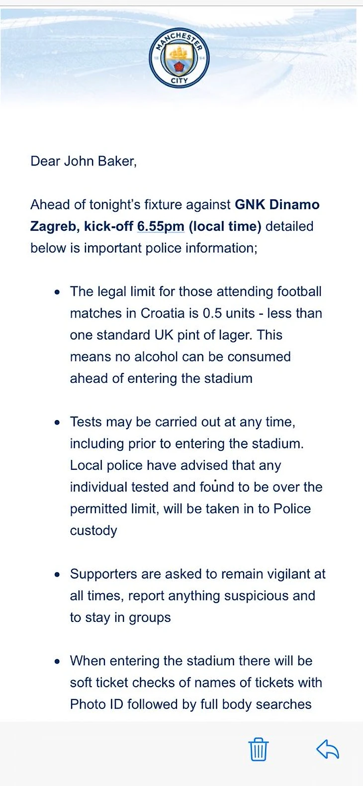 Перед выездом в Загреб на матч ЛЧ фанатов «Сити» поразили хорватские законы. За несколько дней до игры клуб выпустил памятку: болельщиков в состоянии опьянения не пустят на стадион. Максимальная допустимая доза – 0,5 единиц алкоголя. По подсчетам «Сити», это меньше пинты (0,5) пива.
