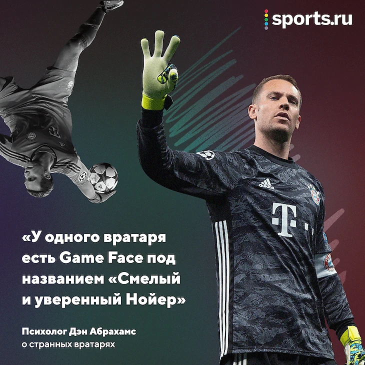 «Я бы не сказал, что вратари сумасшедшие, – сказал Sports.ru Абархамс. – Киперы просто делают сложную работу, а для убедительности стараются выполнять ее с абсолютной внешней уверенностью. Эту показную уверенность и путают с сумасшествием. Все это маски: например, у одного вратаря, с которым я работаю, есть Game Face под названием «Смелый и уверенный Нойер». Смелый и уверенный – два слова описывают поведение, которое он хочет воспроизвести на поле. А Нойер – просто ему нравится думать, что он Нойер.