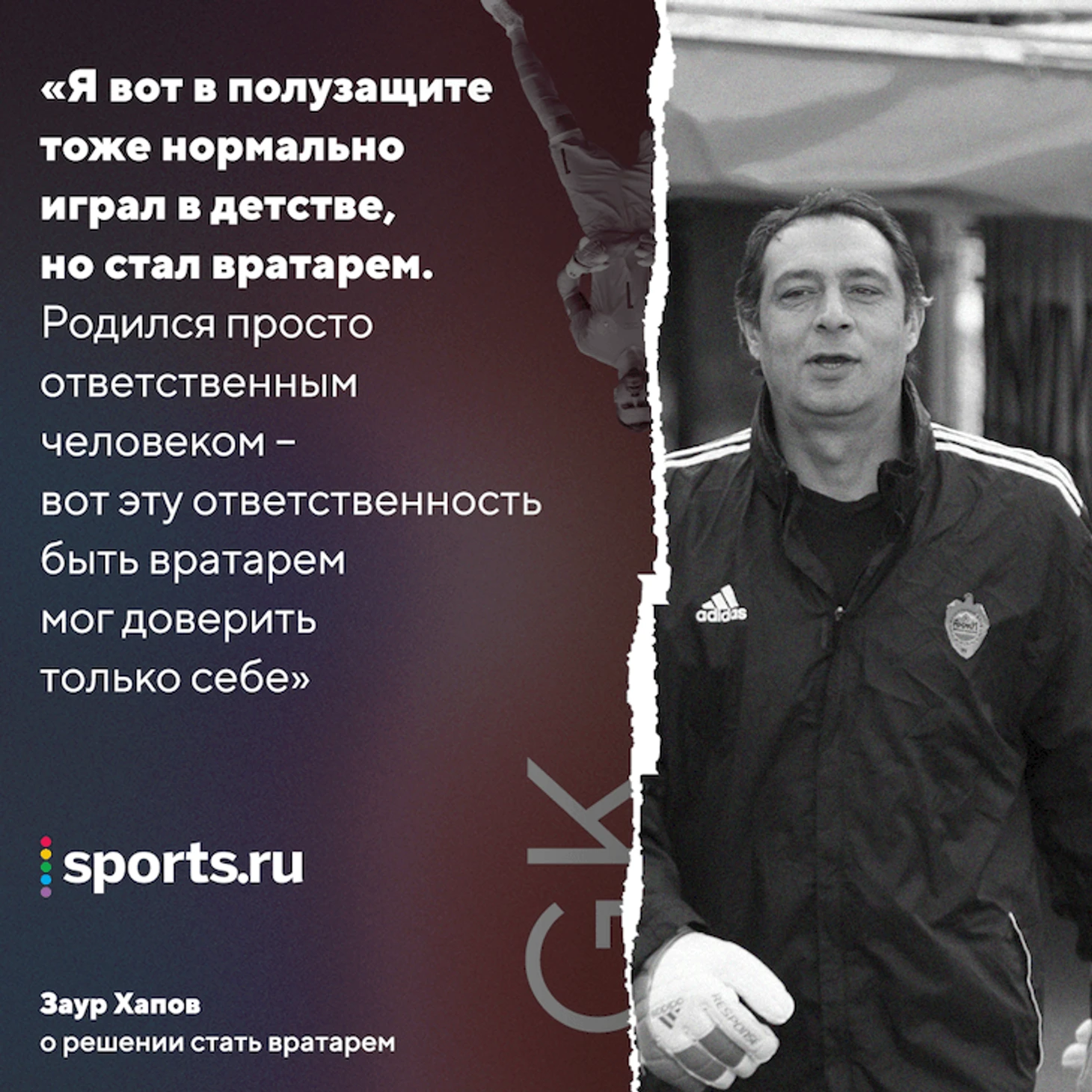 «Не верю в эти версии, что бегать лень было, что не получалось в поле, поэтому и стал вратарем, – говорит Хапов. – Я вот в полузащите тоже нормально играл в детстве, но стал вратарем. Почему? Родился просто ответственным человеком – вот эту ответственность быть вратарем мог доверить только себе. Мне даже хотелось этой ответственности, нравилось помогать команде в сложной позиции».