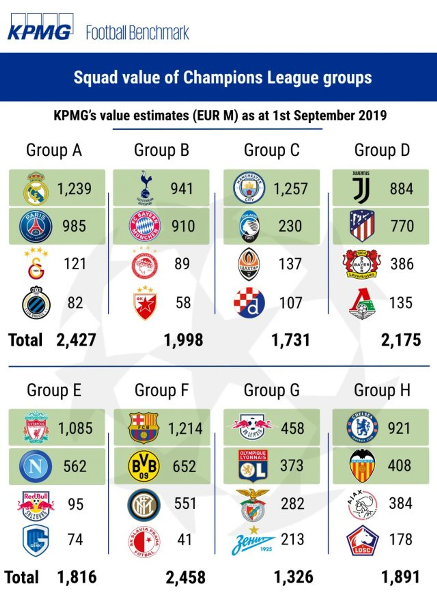 Только в группе А («Реал Мадрид» и «Пари Сен-Жермен»), в группе В («Тоттенхэм» и «Бавария») и в группе Н («Челси» и «Валенсия») первые две позиции в рейтинге поменялись местами по сравнению со стоимостью состава. Правда в случае «Бавария»-«Тоттенхэм» разрыв минимален.