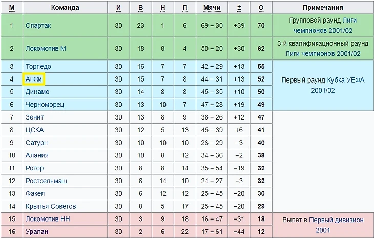 Сезон 2000. Анжи неожиданно занимает 4-е место и попадает в кубок УЕФА.