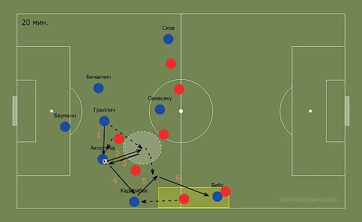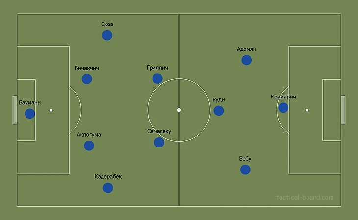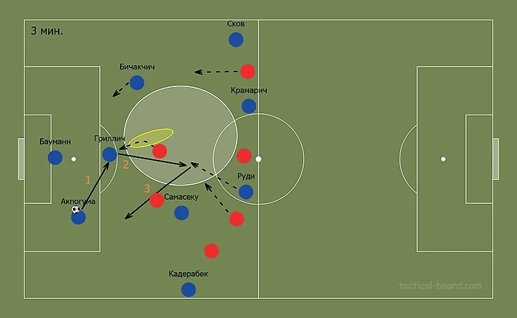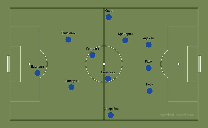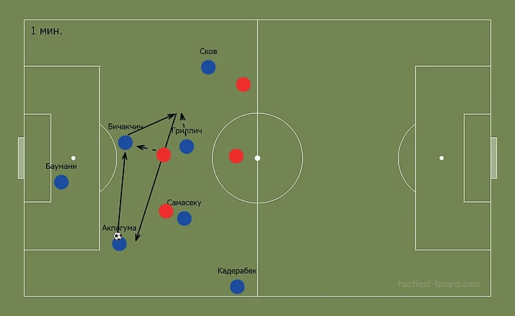 Посмотрев этот матч, можно определить структуру начала атаки, как 3-1. Это действительно правда, но с одной оговоркой. Эта схема очень условна, можно найти, например, много эпизодов, где опорный полузащитник не опускается и в первой линии только два центральных защитника. Как первая линия билд-апа, так и вторая имеют большую свободу в перемещении, смене позиций (например, Акпогума с Бичакчичем или выше Адамян с Крамаричем).