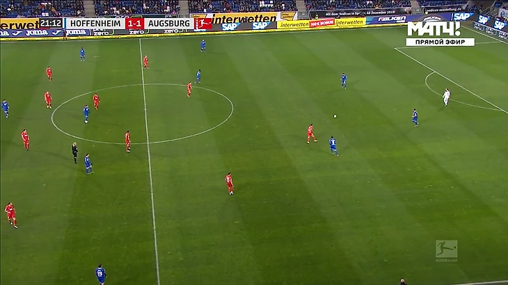 В большинстве эпизодов «Аугсбург» располагался в низком блоке, пытаясь перекрывать возможные зоны для продвижения мяча. Это у них действительно получалось, команда Мартина Шмидта отказалась от мяча, выжидая момент для взрывной контратаки. Подтверждением моих слов есть статистика – PPDA в этом матче 31,43 (у «Хоффа» 5,87).