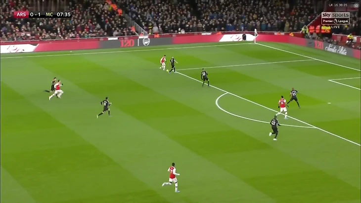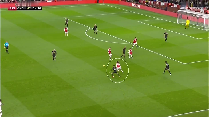 Например, на первой минуте из-за путаницы между Отаменди и Фернандиньо хороший момент получил Мартинелли. Редкий эпизод, когда «Арсенал» вышел в быструю атаку за счет короткого паса, завершился опасным входом в штрафную и ударом Пепе.