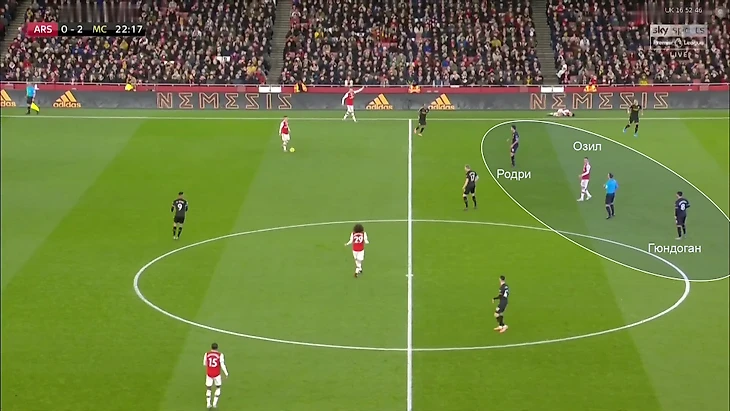 Проблемные эпизоды разделились на два типа. Первый – Месут надежно перекрыт из-за схемы «Сити». Он оказывается в опорной зоне против сразу двух соперников.