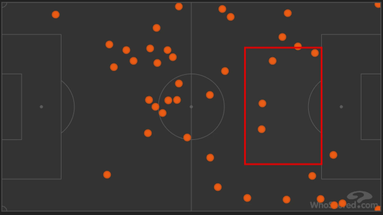 Обе ситуации олицетворяют структурные проблемы и хорошо отображаются в карте передач Озила. Обратите внимание, как пусто в опорной – Месут либо опускался для продвижения, либо находился в опорной, но в меньшинстве и почти не получал мяч: