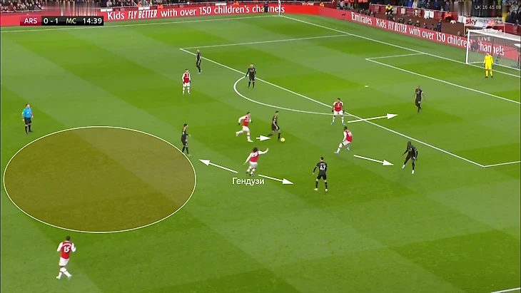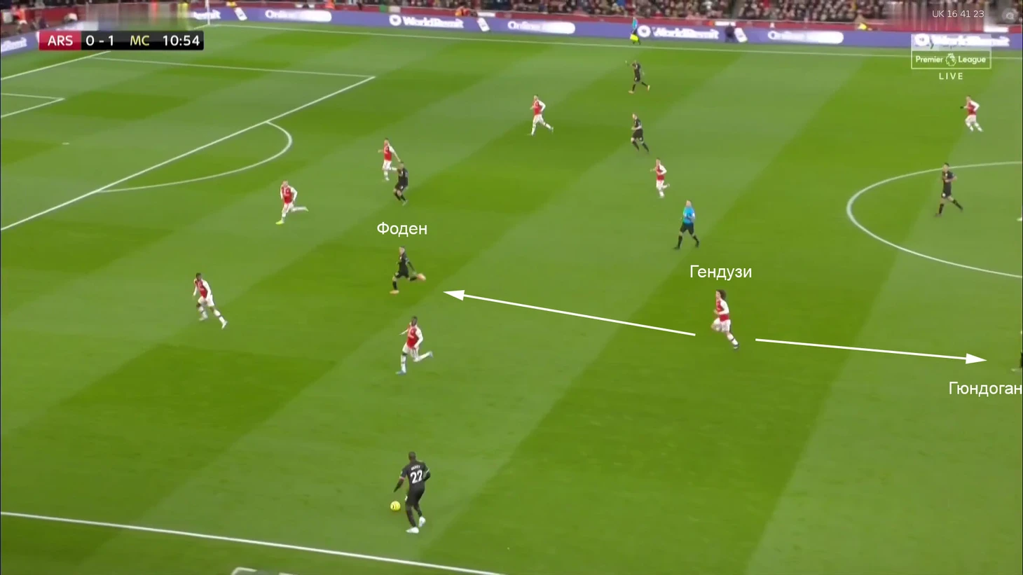 Лучше всего это проявилось в эпизоде со вторым голом «Ман Сити». «Арсенал» пытается накрыть сразу после потери, но из-за нехватки поддержки Гендузи оказывается один против двух соперников с огромной свободной зоной за спиной: