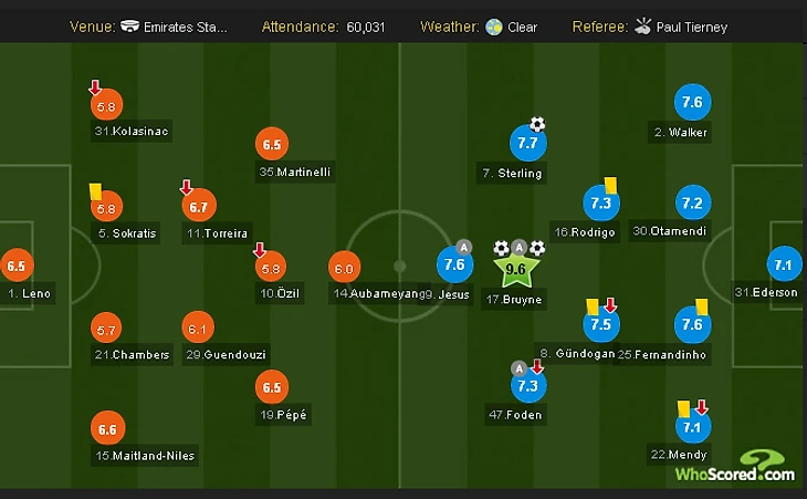 Фернандиньо беспрепятственно прошел через центр поля и отдал передачу на ход Жезусу. Нападающий принял мяч, и недолго думая отдал передачу вглубь штрафной площади «канониров». Набегавший Де Брюйне был точен – 0:1.