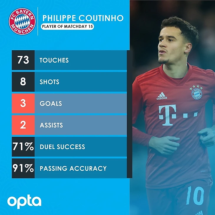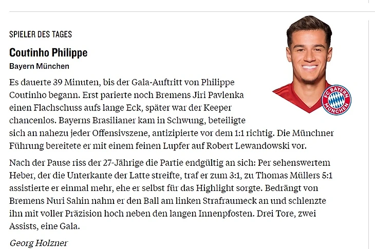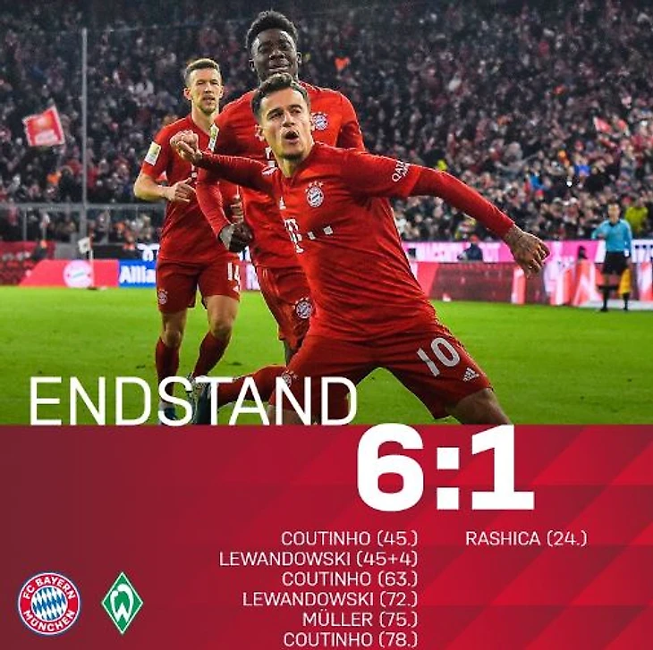 Во втором тайме стало ясно, что парад Коутиньо на 45-й минуте только начинался: ещё дважды бразилец забил в этом матче и отдал один ассист Мюллеру, который за пять минут после выхода на поле на замену помимо своего собственного гола также отдал голевую передачу на Левандовски. «Вердеру» же оставалось радоваться только первому краткому возвращению Бартельса после девяти месяцев отсутствия из-за травмы. Во второй половине гостям из Бремена было абсолютно нечего предложить против «рекордмайстера», который явно хочет закончить осень всё же на позитивной ноте.