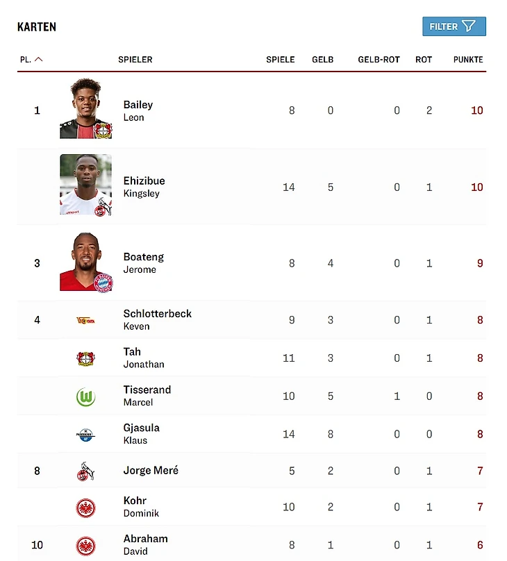 Удаление Леона Бэйли стало 77-й красной карточкой для «Байера» в истории Бундеслиги.