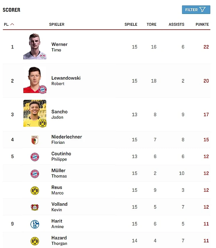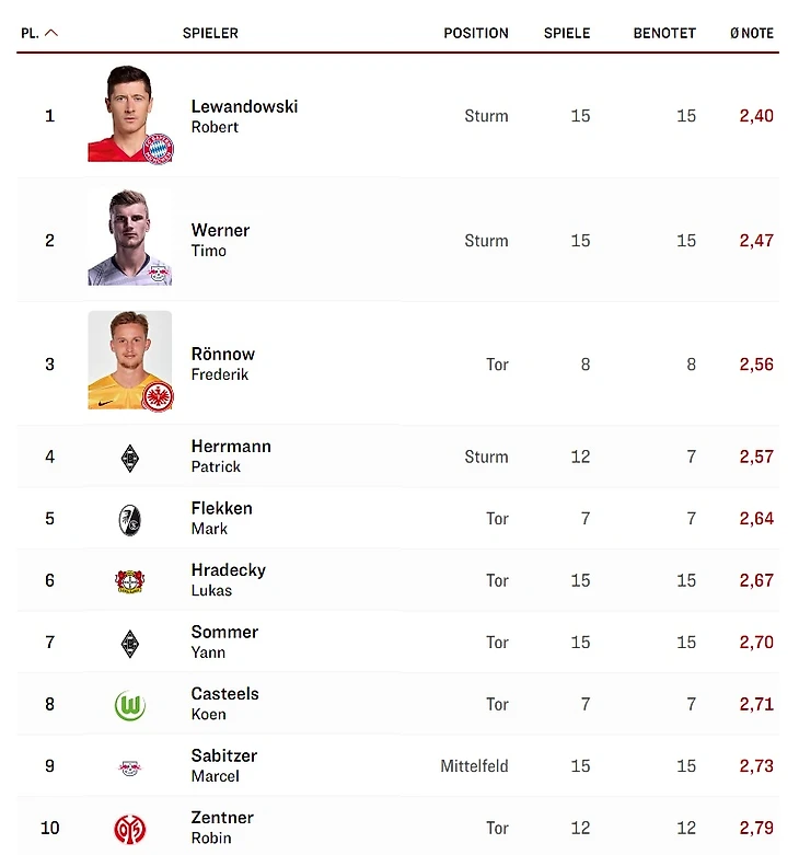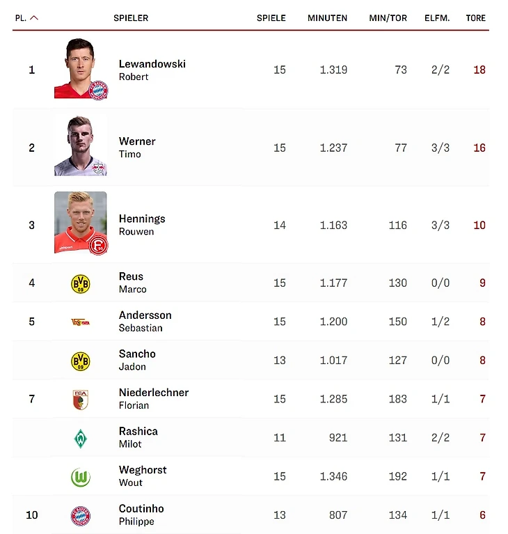 Роберт Левандовски забил 220 голов Бундеслиги и обогнал Юппа Хайнкеса на третьем месте в списке лучших бомбардиров за всю историю; только Герд Мюллер (365 голов) и Клаус Фишер (268) забили больше голов в Бундеслиге.