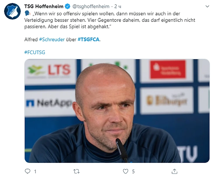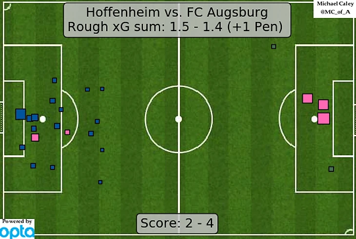 Во второй же половине, пусть контроль и оставался в руках «Хоффенхайма», «Аугсбург» довольно быстро вновь перевернул матч в свою пользу, когда после Акпогума на Нидерлехнере был назначен пенальти, который реализовал всё тот же Макс. Спустя ещё несколько минут поймавшие кураж гости забили ещё один гол после потери мяча Бабу и после ещё одного ассиста Нидерлехнера, на сей раз с центральной линии на Йенсена. Немного вернуться в игру хозяева смогли только на 80-й минуте, когда с передачи Скова с левого фланга Локадия забил головой. Но «Аугсбург» вновь разрушил и малейшую радость, забив свой четвёртый гол, в котором вновь поучаствовал Нидерлехнер, который с контратаки проассистировал Яго. 76 % владения мячом к 24%, 19 ударов по воротам к шести, а счёт на табло всё равно 2:4 с персональным супер выступлением Флориана Нидерлехнера. И за своей следующей попыткой вырваться из потока безуспешных выступлений «Хоффенхайм» отправляется в Берлин.