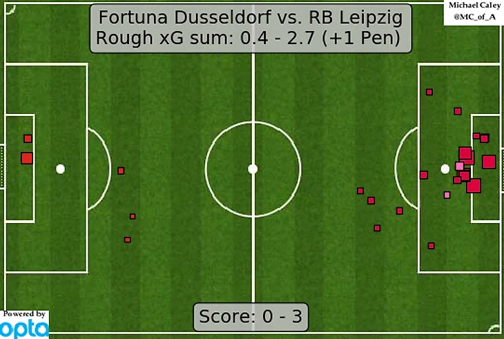 «РБ Лейпциг» неудержим — в Дюссельдорфе клуб одержал свою уже шестую победу подряд в Бундеслиге. Уже на второй минуте матча счёт был открыт в пользу гостей, и вновь ранний гол записал на себя Шик. Уверенности «Лейпцигу» это придало, и практически весь первый тайм «Фортуна» по большей части надеялась на свою защиту и удачу: реализация гостей явно подводила. Под конец первого тайма «Дюссельдорфу» удалось даже создать опасный момент, когда после отличной работы Томми Ковнацки попал в штангу.