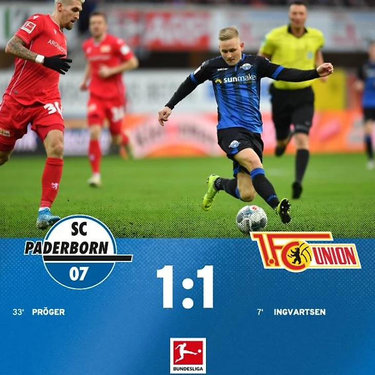 В прошлом году оба клуба играли во второй Бундеслиге, а в этом показывают столь различные результаты в первой. И началась игра в соответствии именно с результатами текущего сезона, а не с успехами прошлого. Берлинцы давили, берлинцы шли вперёд, и довольно быстро это окупилось, когда на седьмой минуте Ингвартсен забил с дальней дистанции. Но проведя отличные полчаса, «Унион» несколько ослабил давление, и «Падерборн» получил пространство и свой шанс ответить, когда Антви-Аджей отдал передачу, которую Гьясуло направил на забившего Прёгера.