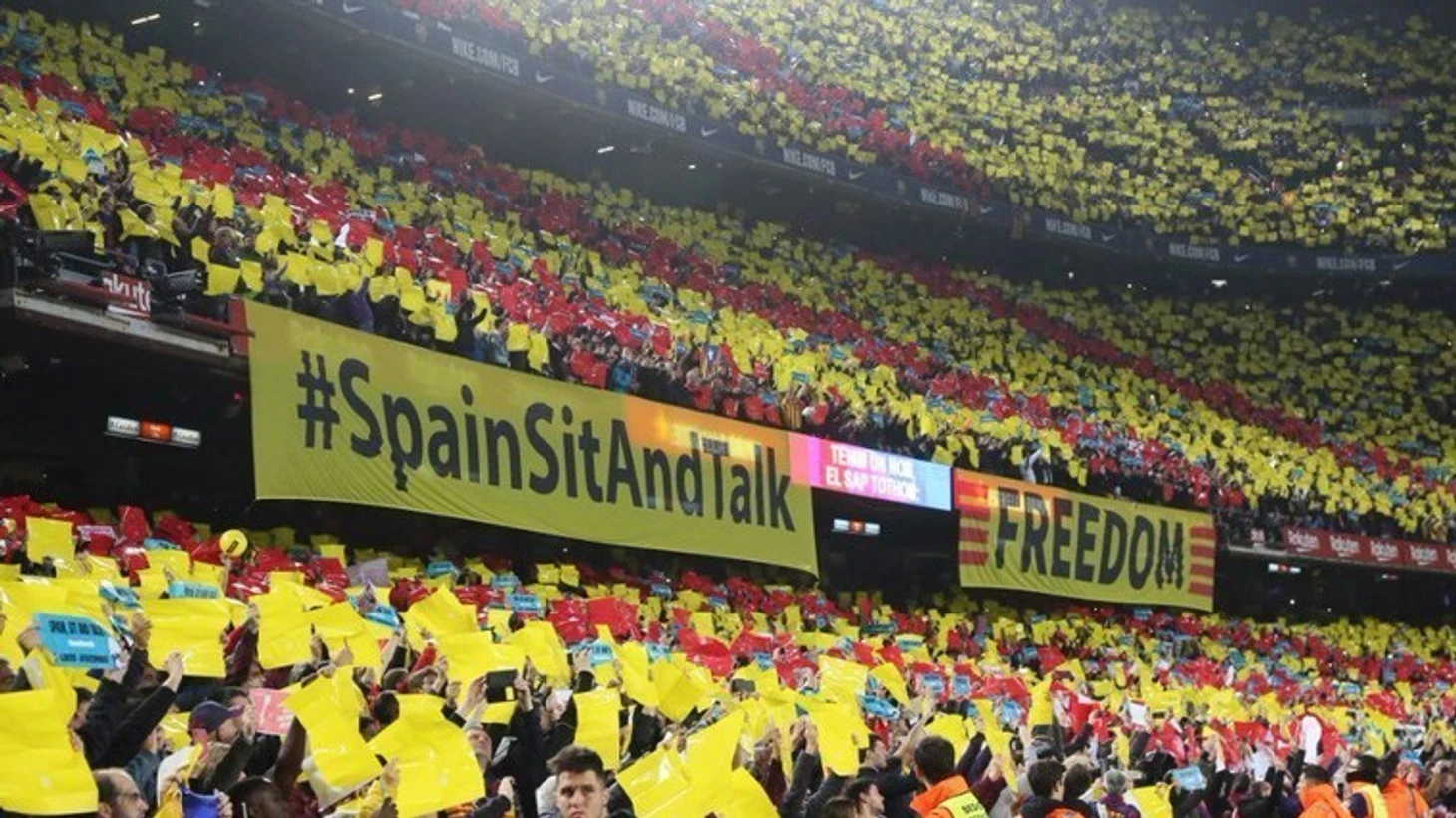Мы уже сообщали о том, что протестная группа Tsunami Democratic готовила акции специально под Эль Класико. На "Камп Ноу" дело ограничилось плакатами "Испания, сядь и поговори!" и "Свобода", а также выбрасыванием на поле на 55-ой минуте мячей с надписью "Сядь и поговори": камеры не показывали эти моменты, предпочитая демонстрировать величавые виды стадиона из телевизионного оборудования, установленного на вертолетах. Но правду скрыть все равно невозможно.