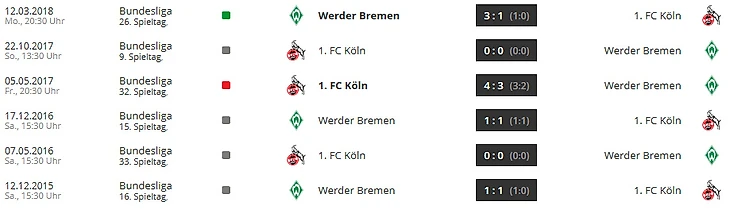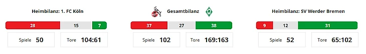 «Кельн» проиграл только один из последних девяти матчей Бундеслиги против «Вердера» (две победы, шесть ничьих). «Кельн» также непобедим уже в течение восьми домашних матчей против «Вердера» (три победы, пять ничьих).