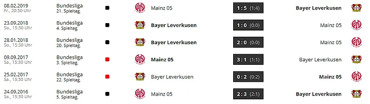 В Майнце за последние шесть встреч обе команды забили 29 голов (12:17 с перевесом «Байера»), всегда не менее четырех мячей за матч.