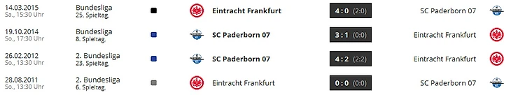 «Падерборн» выиграл оба домашних матча против «Айнтрахта»: пять лет назад в Бундеслиге со счетом 3:1 и в сезоне 11/12 во Второй Бундеслиге ‒ 4:2.