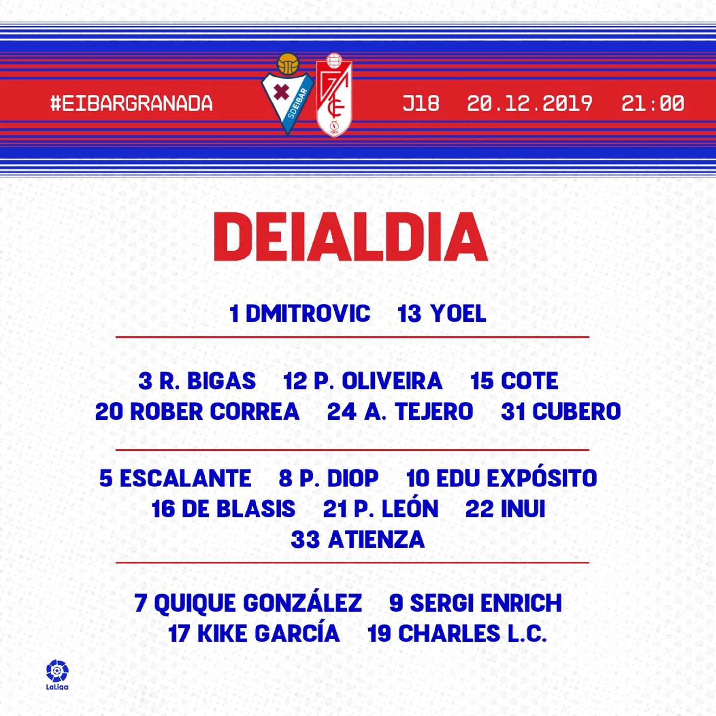 Мендилибар вызвал на матч с «Гранадой» 19 футболистов, в том числе двух игроков резервной команды — Серхио Куберо и Мигеля Атиенсу. В строй после травмы вернулся Коте, Диоп отбыл дисквалификацию из-за перебора жёлтых карточек.