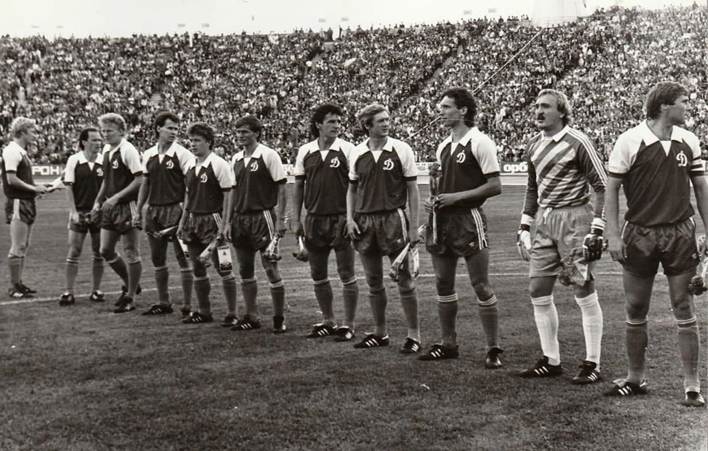 «Серебряные» призеры Евро-1988 из Киева 31 августа 1988 года перед матчем с «Зенитом». Вскоре им в торжественной обстановке ленинградцы вручат цветы. Слева направо: Алексей Михайличенко, Игорь Беланов, Олег Кузнецов, Геннадий Литовченко, Александр Заваров, Василий Рац, Андрей Баль (единственный не призер), Владимир Бессонов, Олег Протасов, Виктор Чанов, Анатолий Демьяненко