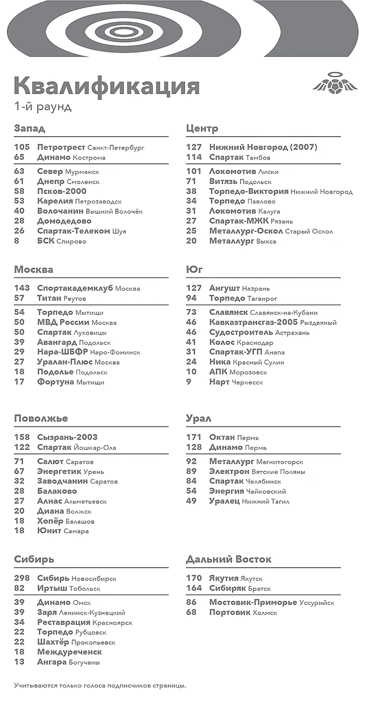 Лучше всех в квалификации ожидаемо проявила себя Сибирь из Новосибирска. Бывший участник земной ФНЛ – единственный, кто набрал больше 200 голосов во всех зонах (и едва не разменял третью сотню). Помимо Сибири ещё 12 команд набрали больше 100 голосов. При этом лискинскому Локомотиву этого оказалось недостаточно, чтобы выйти во второй раунд квалификации – Нижний Новгород и тамбовский Спартак набрали ещё больше.