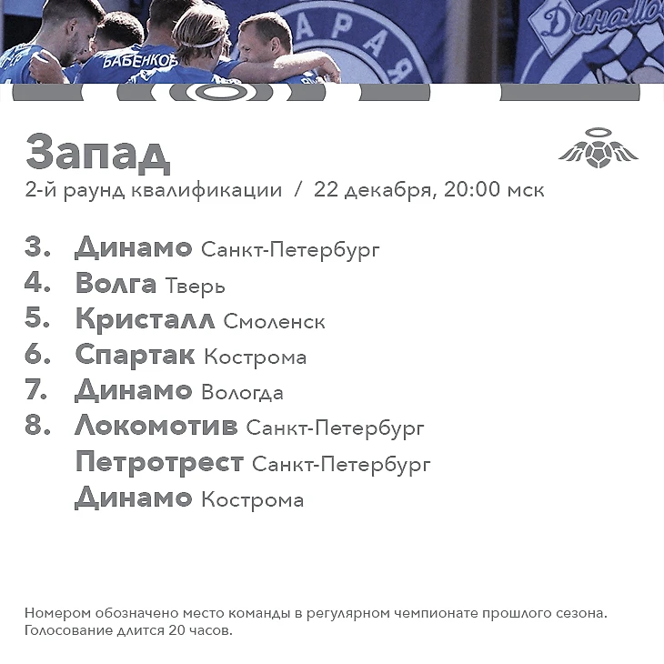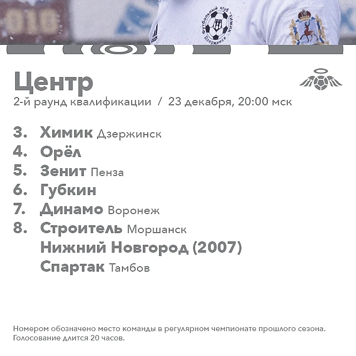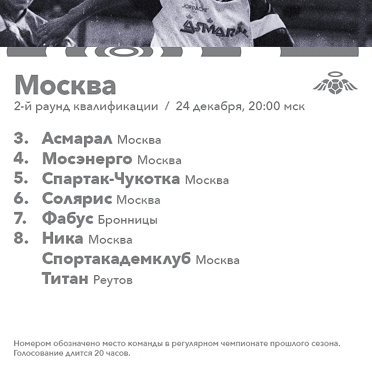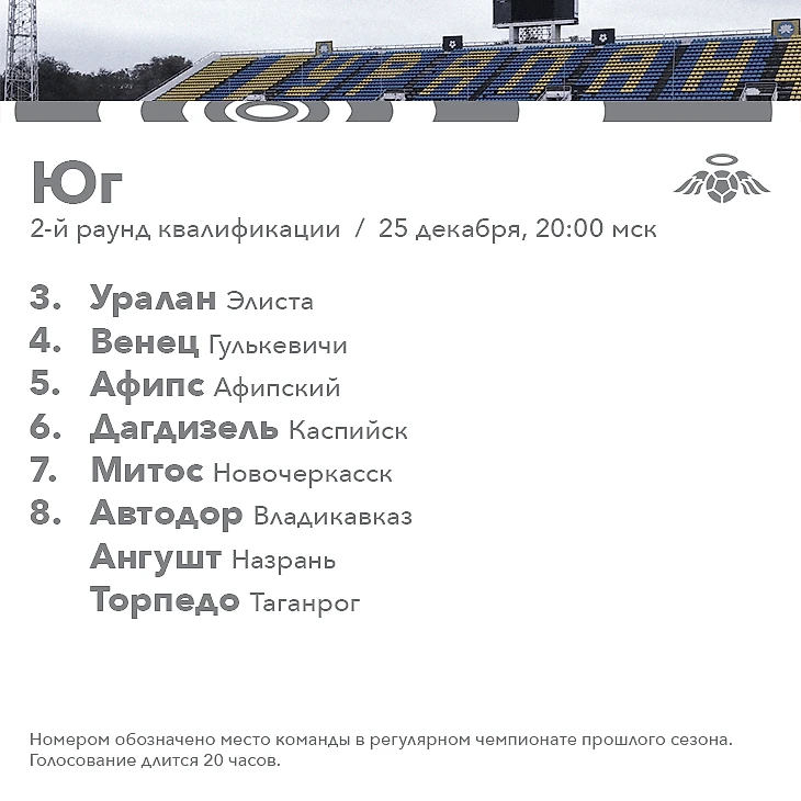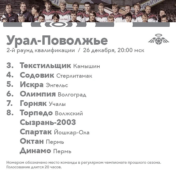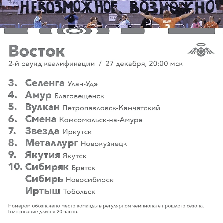 Команды были разделены на 8 зон по географическому принципу. Внутри каждой зоны запускалось 20-часовое голосование на нашей странице ВК. По его итогам, с учётом голосов только подписчиков страницы, определялись два лучших клуба, которые отправлялись в следующую стадию.