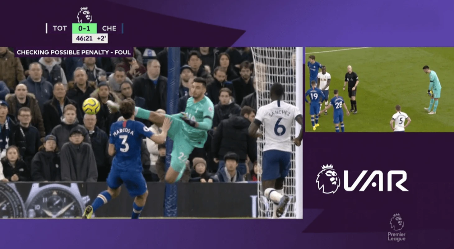 На правом фланге «Тоттенхэма» образовалось пространство, в которое рванул Маркос Алонсо. У вратаря не было выбора – нужно было идти спасать. Получилось очень странно: Гассанига выходом явно напугал Алонсо, который сбавил ход и отвернул в сторону, но вместо классного и эффектного выноса вратарь махнул мимо мяча и по инерции все же влетел в соперника.