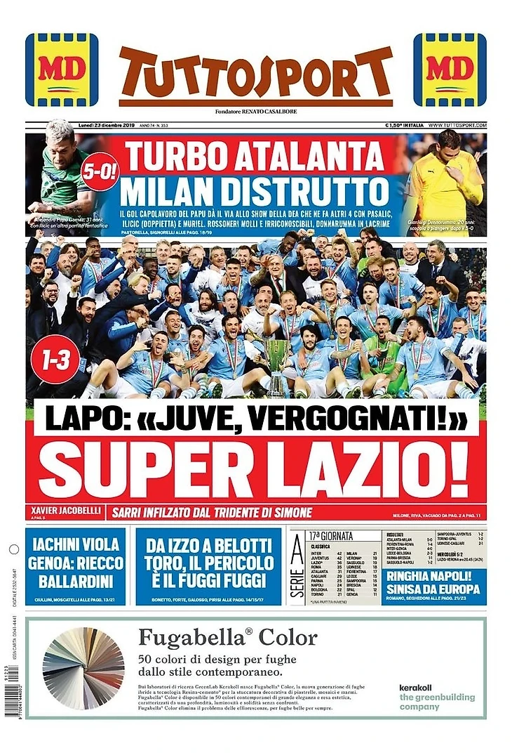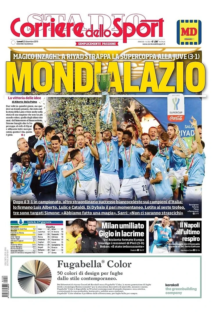 Волшебник Индзаги: в Рияде вырван Суперкубок у «Юве» (3:1). После 3:1 в чемпионате, ещё один невероятный успех Бьянкочелести над чемпионами Италии: его принесли Луис Альберто, Лулич и Катальди. От Дибалы временное сравнивание счёта. Лотито с шестым трофеем, три были принесены Симоне: «Мы творим волшебство». Сарри: «Не будет никаких последствий».