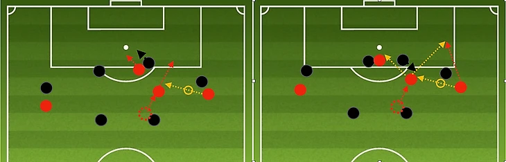 Точно так же игрок второго фронта врывается в это же свободное пространство, чтобы либо самому довести момент до удара, либо обыграться в пас с игроком широкого фронта. Если на него выскакивает второй центральный защитник, то это развязывает руки игроку первого фронта, который теперь может совершить резкое движение в освободившуюся зону в центре.
