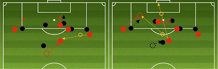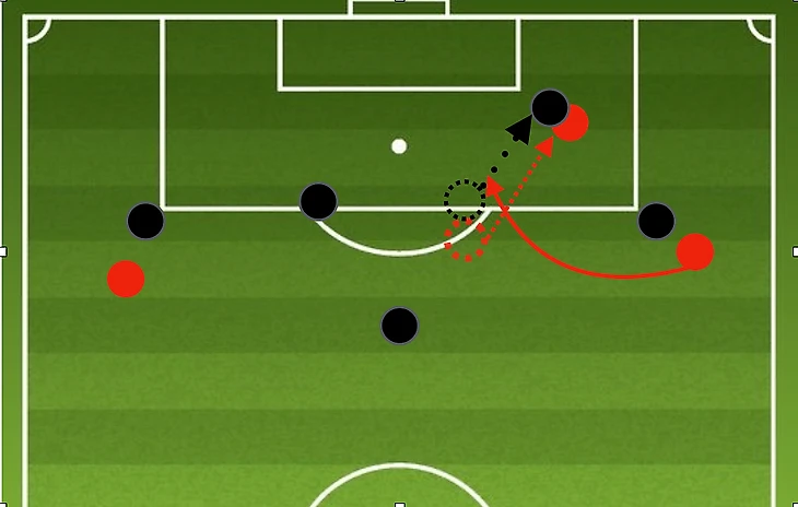 Для того, чтобы корректно отзащищаться в этом случае, вслед за игроком второго фронта должен пойти опорный полузащитник. Это позволит сохранить численный перевес в штрафной площадке и уменьшит количество свободных зон для нападающих. В этот момент как раз и включается игрок дальнего фронта, который врывается в освобожденную опорником зону для нанесения дальнего удара. Помимо этого если все защитники смещены к одной стороне поля, игрок дальнего фронта должен резко перевести мяч на другой фланг, где фланговый игрок может врываться в слепую для защитника зону и получать мяч в штрафной площадке, двигаясь лицом к воротам либо же мгновенно бить по нему.