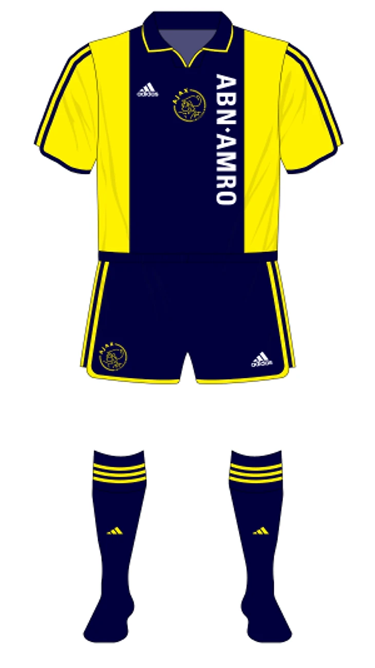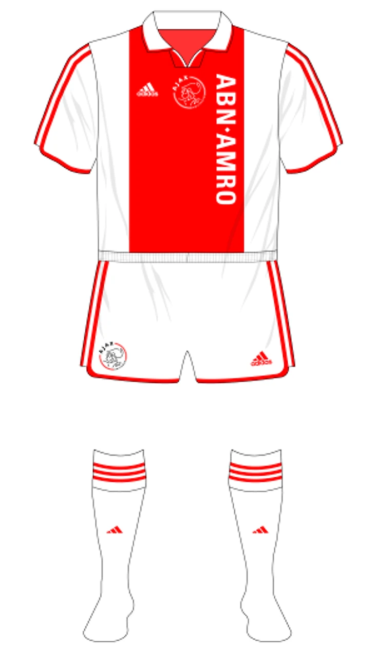 В июле 2000 года «Аякс» объявил, что после 11 лет с Umbro переходит к adidas. Немцы дебютировали с традиционного для клуба белого комплекта со знаменитой вертикальной полосой красного цвета в центре футболки. Обратите внимание на фирменные адидасовские длинные полоски по краям футболки и шорт.