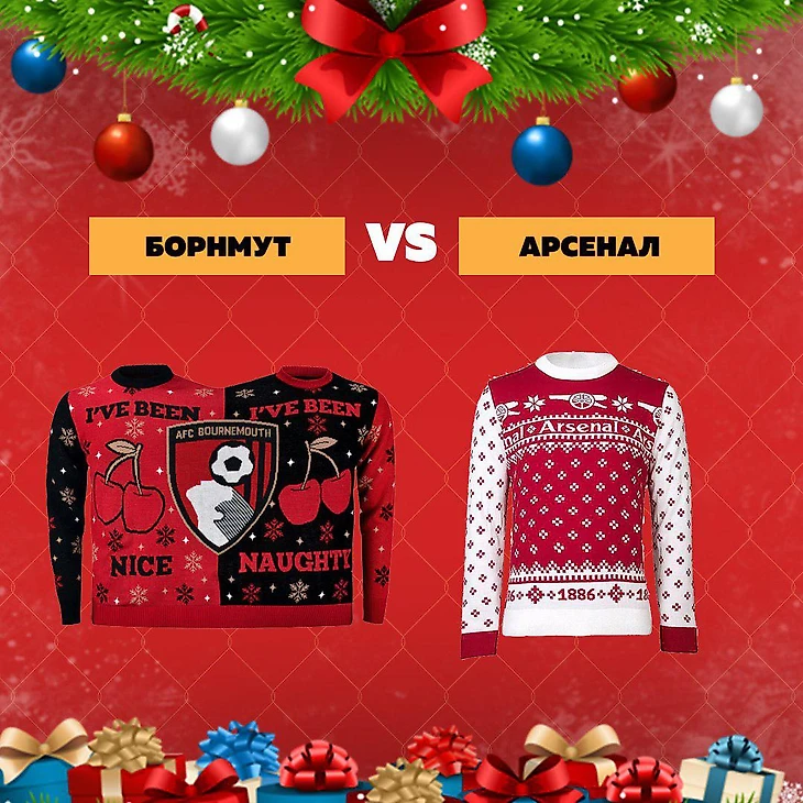 «Арсеналу» легко можно выпускать собственную рождественскую коллекцию всего на свете, благо цвета этому способствуют. Вот и свитер получился приятным глазу: традиционный орнамент доработан годом основания и названием клуба, а в центре знаменитые пушки. Но «канонирам» просто не повезло попасть именно на «Борнмут». Что может быть круче двойного рождественского свитера от «вишенок»?!