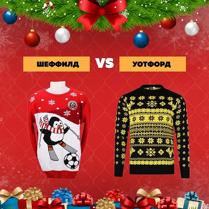«Шеффилд», как и «Брайтон» неплохо приспособил образ милой зверушки, накинув на нее шарф. Правда, в отличие от «чаек», пингвин на лыжах и с футбольным мячом кажется слишком большим. Клубный логотип тоже кажется неорганичным, но общая композиция вполне смотрится. Про «Уотфорд», наверное, лучше промолчать. Свитер в лучшем случае осенний, от сочетания цветов и обилия элементов начинает рябить в глазах. Странно, что «шершни» никак не использовали образ лося со своей эмблемы. Еще один свитер, в котором мы не хотели бы оказаться, как, собственно, и на месте «Уотфорда» в таблице АПЛ.