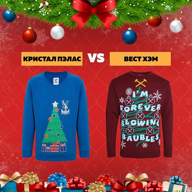 Жаль, но «Пэлас» сделал что-то совсем уж непраздничное, на уровне масс-маркета с принтом, сделанном в Paint, который вовсе необязателен к покупке. У «Вест Хэма» забавный свитер, но это лишь один из примеров. Их рождественская коллекция точно заслуживает внимания, а на этой кофте радует надпись I’m forever blowing baubles из любимой песни всех фанов «молотобойцев».