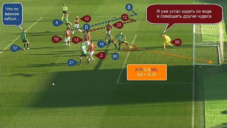16. “Красно-чёрные” возобновили игру с точки, понеслись в атаку и попали в плен. Сперва удар Кессиэ был заблокирован, после этого у него отобрали отскочивший мяч и уже через 15 секунд счёт стал 3:0. Пашалич уважил передачей Малиновского, тот осмотрелся и вернул ему обратно (Беннасер не успел перехватить). Хорват заметил одинокого Иличича правее. Йосип замешкался и подарил надежду Калабрии на благоприятный исход эпизода, но после ложного замаха левой, мощно выпалил с правой в дальний угол.